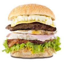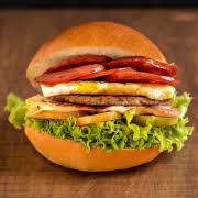 Pão, bife, queijo, ovo, bacon, alface, tomate, batata e milho