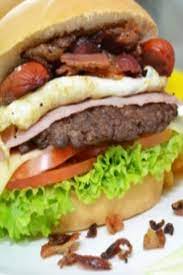 Pão, bife, presunto, bacon, alface, tomate, batata e milho